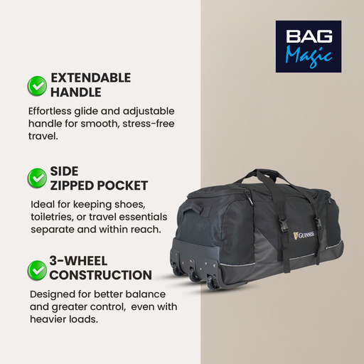 Guinness® Large Wheeled Holdall 80cm - 3-Wheeled Travel Duffel Bag with Extendable Handle